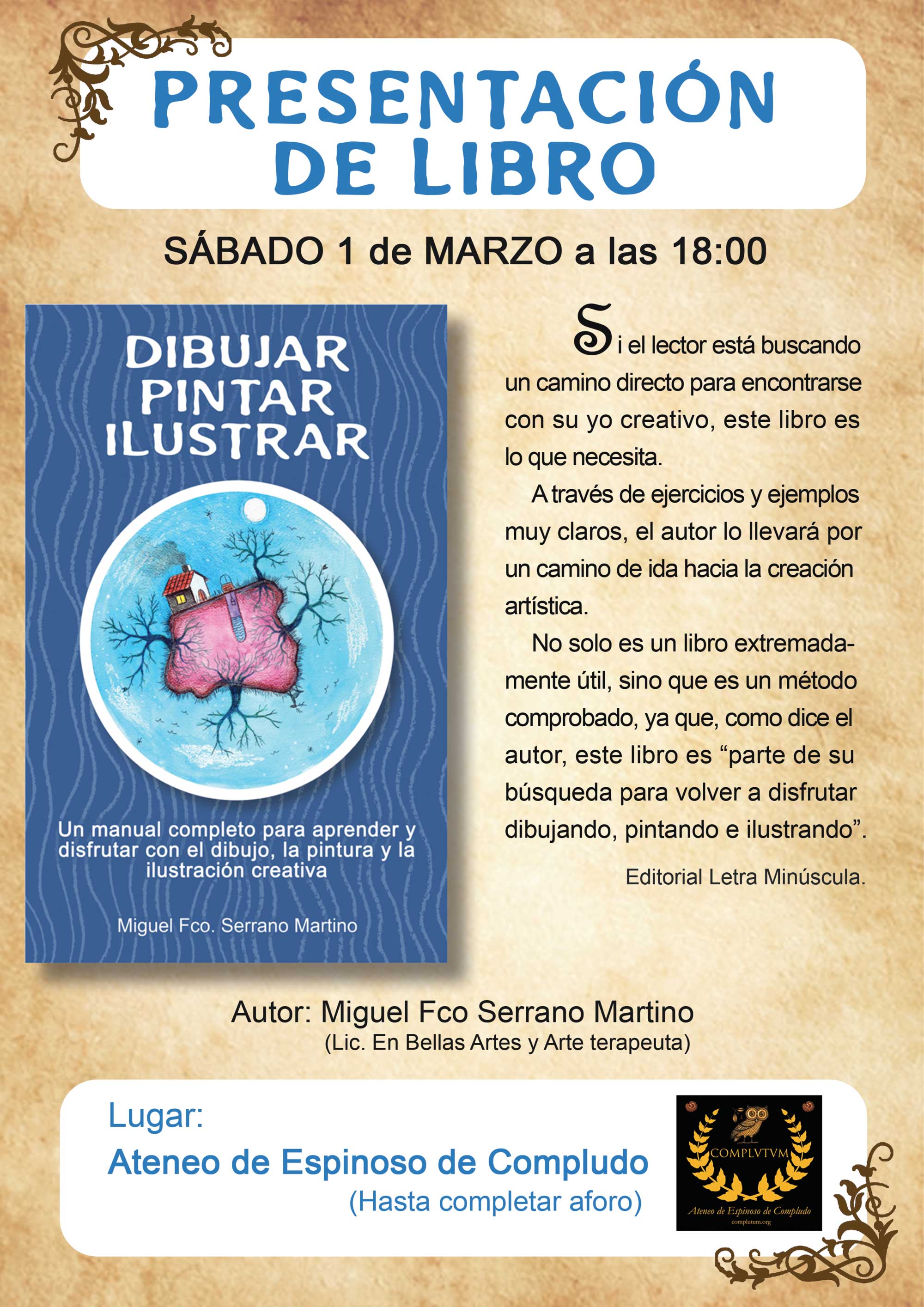 El próximo sábado 1 de Marzo a las 18.00 h tendrá lugar en el Ateneo COMPLVTVM de Espinoso de Compludo la presentación del libro “DIBUJAR PINTAR ILUSTRAR” del autor Miguel Serrano Martino, vecino de la localidad. Un manual completo para aprender y disfrutar con el dibujo, la pintura y la ilustración creativa. Publicado por la Editorial Letra Minúscula.